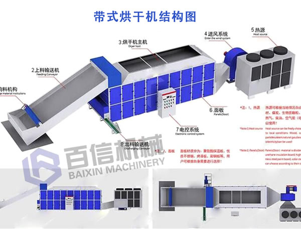 帶式花椒烘干機是一種批量、連續式生產的干燥設備,主要加熱方式有煤加熱、 熱風加熱。標配為全不銹鋼網帶,外壁碳鋼防銹油漆,潔凈美觀。