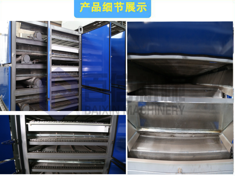 百信多層連續式帶式辣椒烘干機脫水干燥迅速, 操作方便,效率運行。能滿足大批量連續生產的需求,網帶式干燥設備廣泛應用于食品(如面條、面皮)、干果(大棗、巴旦木、腰果、開心果)、花茶(玫瑰花、紅薯、金銀花、山楂花)、農副產品(如玉米、紅薯烘干袪潮)、脫水蔬菜(如大蒜、紅薯、紅薯、辣根、洋蔥、白菜干、生姜、小香蔥、辣根、菠菜)、瓜果(如紅薯、薯片、紅薯、葡萄干、哈密瓜)、中草藥、(連翹、黃蜀葵、枸杞、)水產品、土特產品、飼料及化工原料等加工之片狀、條狀、塊狀和顆粒狀物料的脫水干燥作業。